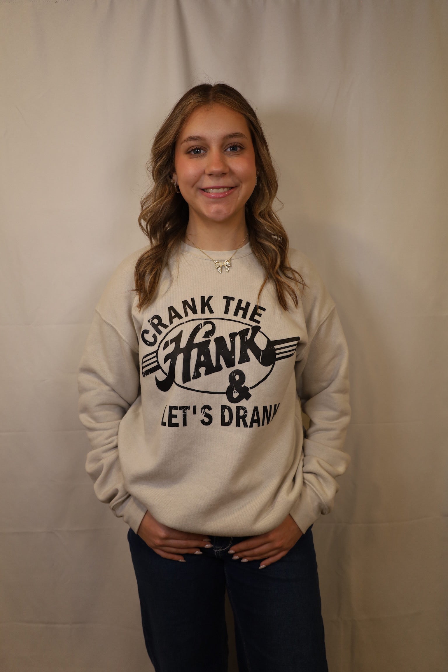 Playful Statement Tee – Bold “Crank the Hank & Let’s Drank” graphic brings the perfect mix of humor and country charm